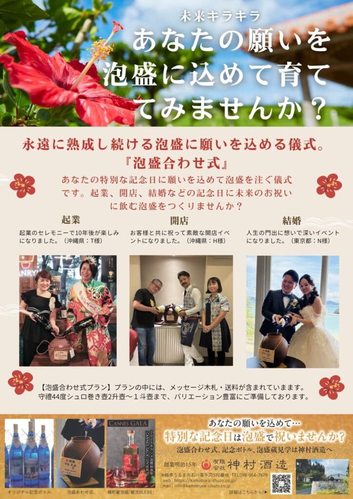 「泡盛あわせ式」は企業(あるいは個人)の更なる成功、発展を祈願しながら、共同で酒壺に泡盛を詰め、貯蔵するとても高貴な儀式です。